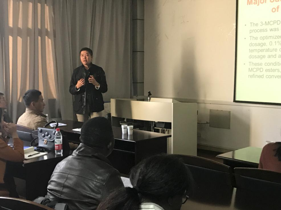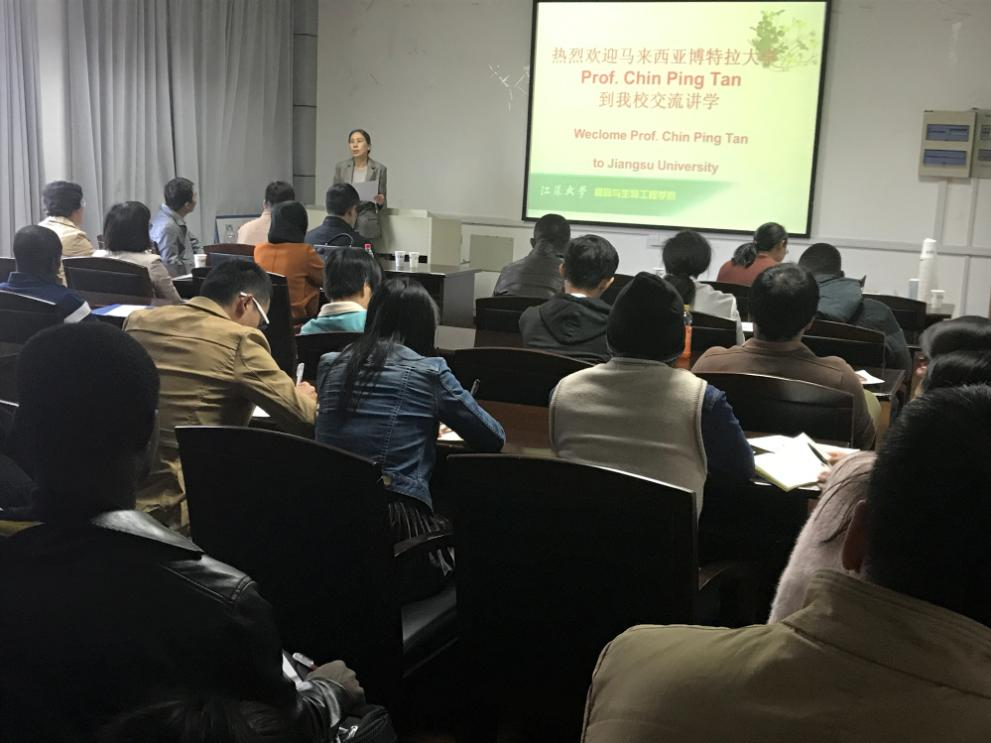 Prof. Dr.Chin Ping Tan from Department of Food Technology, Faculty of Food Science and Technology, University Putra Malaysia, visited Jiangsu University on Oct., 30. Huang Xingyi, the vice dean of School of Food and Biological Engineering, introduced Dr. Chin. Prof. Chin Ping Tan delivered an academic lecture named Macro, Micro and Nanoscales of Lipids for Healthier Future.