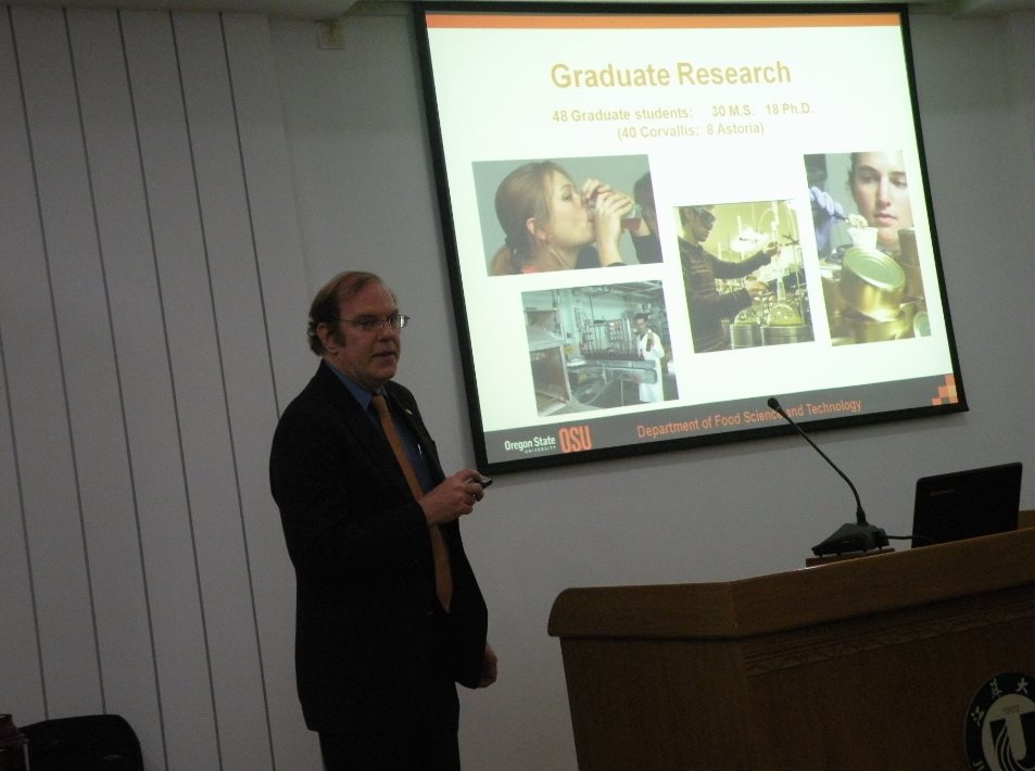 On Apr. 25, Robert McGorrin and Yanyun Zhao from Oregon State University Visited Jiangsu University.Prof. Robert McGorrin introduced Oregon State University and the Department of Food Science and Technology (FST). Prof. Yanyun Zhao delivered an academic lecture named Edible coatings and films for enhancing food quality and ensuring food safety. Ma Haile, Dean of School of Food and Biological Engineering, and some faculty members and students of the school attended the lecture.