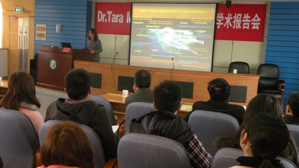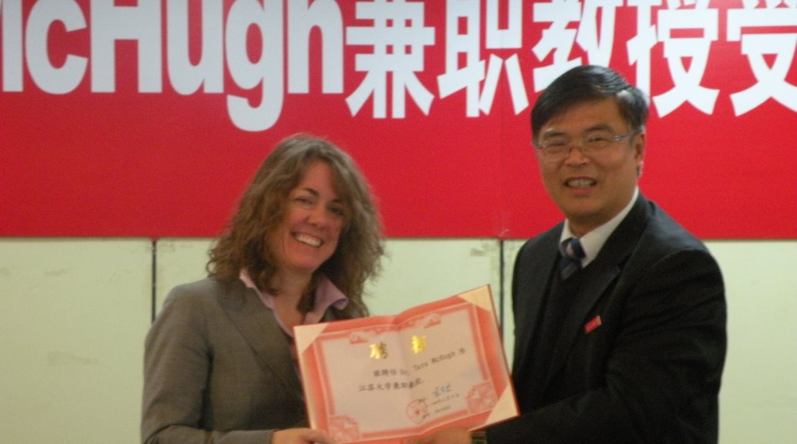 On Mar. 13, Tara McHugh from Western Regional Research Center, United Department of Agriculture Research Service, was appointed part-time professor of Jiangsu University. Ma Haile, Dean of School of Food and Biological Engineering, and some faculty members and students of the school attended the ceremony. At the ceremony, Shi Weidong, the vice President, granted Dr. McHugh a letter of appointment, pinned a Jiangsu University emblem for her. Dean Ma Haile made a brief introduction of Dr. McHugh’s Curriculum Vitae and major academic achievements. After the ceremony, Dr. McHugh made a lecture entitled Innovative Food Processing for Improved Health, Safety and Sustainability.