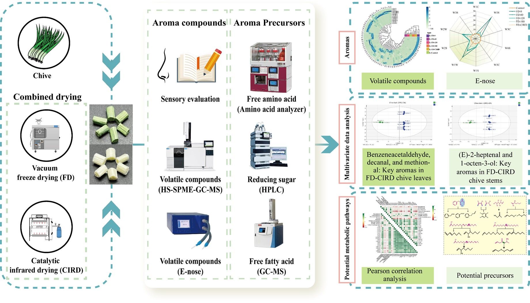 香葱是速食食品和食品加工中的重要调味原料。干制香葱的风味是影响消费者可接受性的重要因素之一,也是评估产品质量好坏的一个重要指标。真空冷冻联合催化式红外干燥(FD-CIRD)是一种串联式干燥技术,具有节能高效、保存样品营养成分以及改善香葱风味等优势。该研究报道了葱叶和葱茎在FD-CIRD过程中关键气味的变化及潜在的形成路径(图1)。GC-MS结合多元数据分析显示,二丙基二硫是影响葱叶和葱茎香气差异的关键香气化合物。关键香气化合物苯乙醛、癸醛和1-辛烯-3-醇增强了FD-CIRD葱叶和葱茎的香气。除冻干样品外,游离氨基酸含量在FD-CIRD阶段含量最高,而还原糖在FD-CIRD阶段含量最低。不饱和脂肪酸的含量在FD阶段逐渐减少,而在FD-CIRD阶段逐渐增加。此外,相关分析表明,苯丙氨酸是苯乙醛的潜在前体,油酸和亚麻酸是癸醛和1-辛烯-3-醇的潜在前体。因此,FD-CIRD技术有助于改善干制香葱的感官特征。