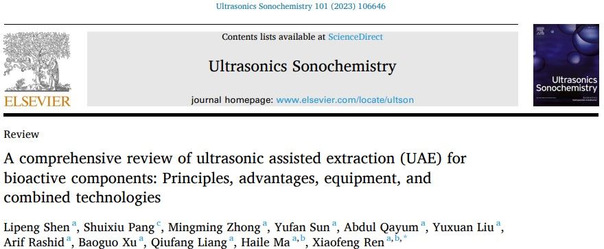 近日,江苏大学任晓锋教授课题组在国际声学顶级期刊《Ultrasonics Sonochemistry》(Q1,IF=8.4)在线发表了标题为 “A comprehensive review of ultrasonic assisted extraction (UAE) for bioactive components: Principles, advantages, equipment, and combined technologies”的综述性论文 (DOI: 10.1016/j.ultsonch.2023.106646)。澳门新葡京官网 | 2025线上开户直达、真钱百家乐、捕鱼游戏、官方授权