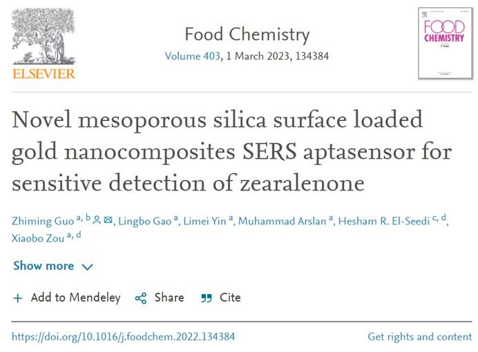 郭志明教授课题组在Food Chemistry (Q1)期刊上发表了题为"Novel mesoporous silica surface loaded gold nanocomposites SERS aptasensor for sensitive detection of Zearalenone"的研究论文。论文第一/通讯作者为郭志明教授,第二作者为硕士研究生高凌波,论文第一单位为江苏大学,瑞典乌普萨拉大学Hesham R. El-Seedi教授参与论文工作。