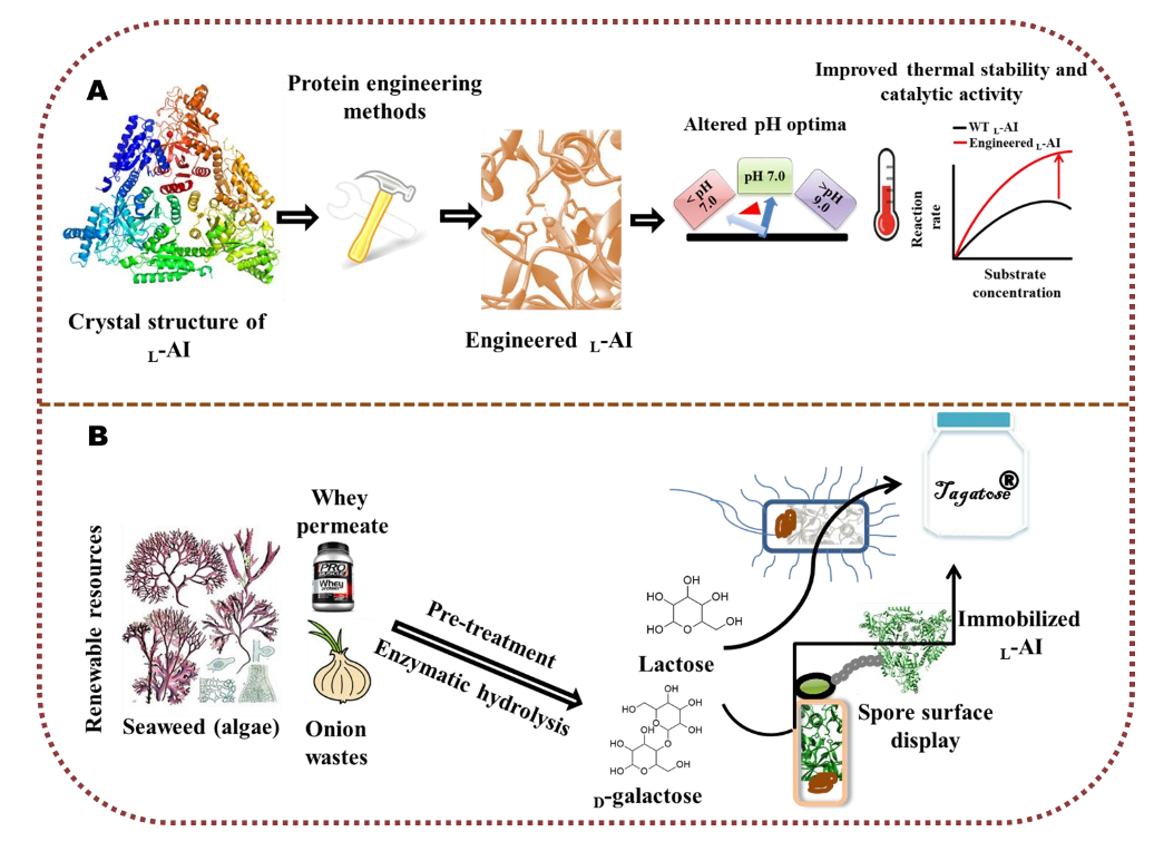 D-塔格糖(D-tagatose)是一种功能性稀有糖,其甜度与蔗糖相似,但热量却不到蔗糖的三分之一,是一种新型的低热量功能性甜味剂。D-塔格糖具有改善肠道菌群、抗龋齿、预防肥胖等生理功能,在食品、医药等领域应用潜力巨大。微生物法制备D-塔格糖因环境友好、催化效率高、条件温和、副产物少等优点备受关注,但微生物法也受到底物成本、转化效率、关键酶性质等因素的影响,从而制约着D-塔格糖生物合成的工业化进程。齐向辉教授课题组针对以上问题,围绕D-塔格糖高产菌株的分离鉴定、新型关键酶的发掘与设计、工程菌株的途径工程改造、酶的固定化、以及廉价底物的D-塔格糖生物制造工艺等方面开展了相关工作,并取得了一系列的研究成果。该文结合齐向辉教授课题组的前期研究成果,对D-塔格糖的功能、应用、制备工艺、工业化瓶颈、商业化前景等进行了综述;重点围绕D-塔格糖的微生物生物制造方法,关键酶-L-阿拉伯糖异构酶的理性、半理性和非理性工程化改造,可再生资源及副产物的高值化与D-塔格糖产量的提升策略,以及工业化过程中遇到的问题与对策进行了针对性的论述。该文可为D-塔格糖的微生物法工业化制造提供有益参考。
