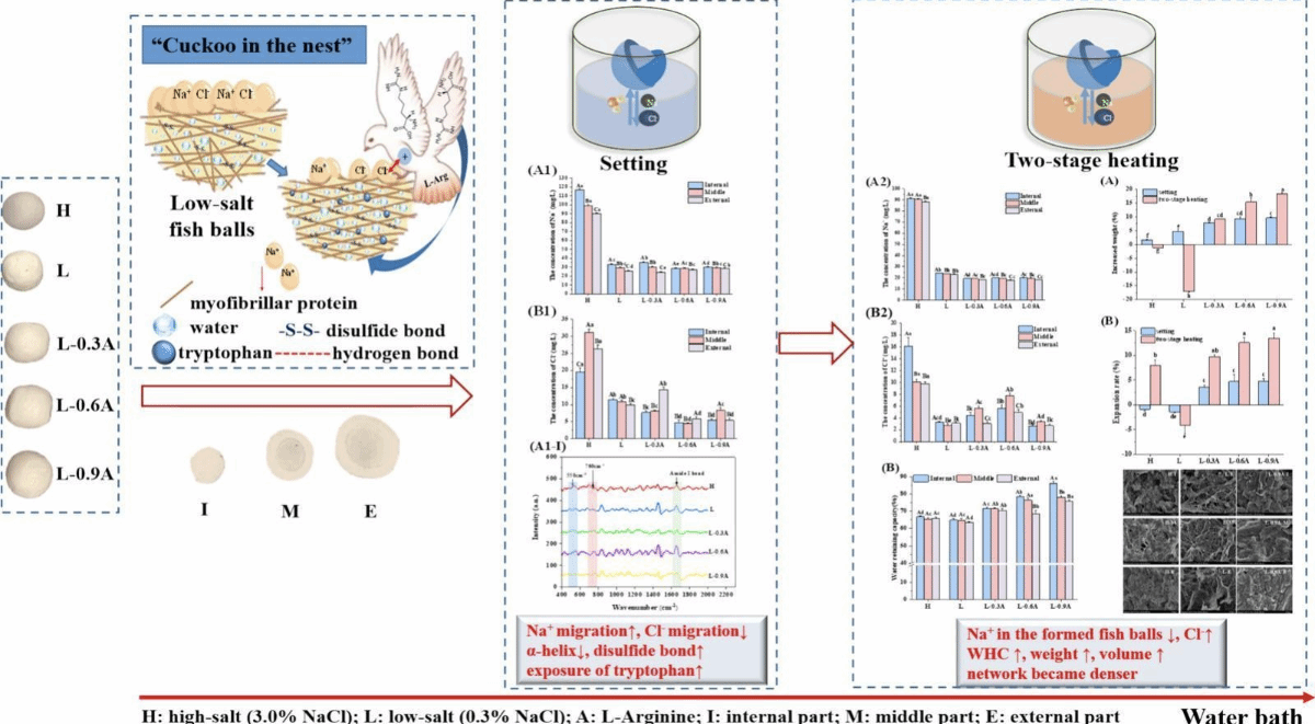 鱼丸加工中常添加2%-3%的盐以促进肌原纤维蛋白溶解和凝胶形成,但高钠饮食的健康风险及消费者对健康饮食的需求促使低盐配方的研究。在鱼丸水浴加工过程中,Na⁺和Cl⁻会与水交换迁移从而进一步降低低盐鱼丸品质,本研究制备了添加(0.3%、0.6%、0.9%)/不添加精氨酸(L-Arg)的低盐鱼丸,利用能量色散 X 射线光谱(EDS)、等离子体电感耦合(ICP-MS)等技术,探究了L-Arg 对鱼丸不同部位(内、中、外)在二段式加热过程中离子迁移及鱼丸品质的影响,从离子迁移的角度丰富了L-Arg 对鱼糜制品减盐保质的理论。