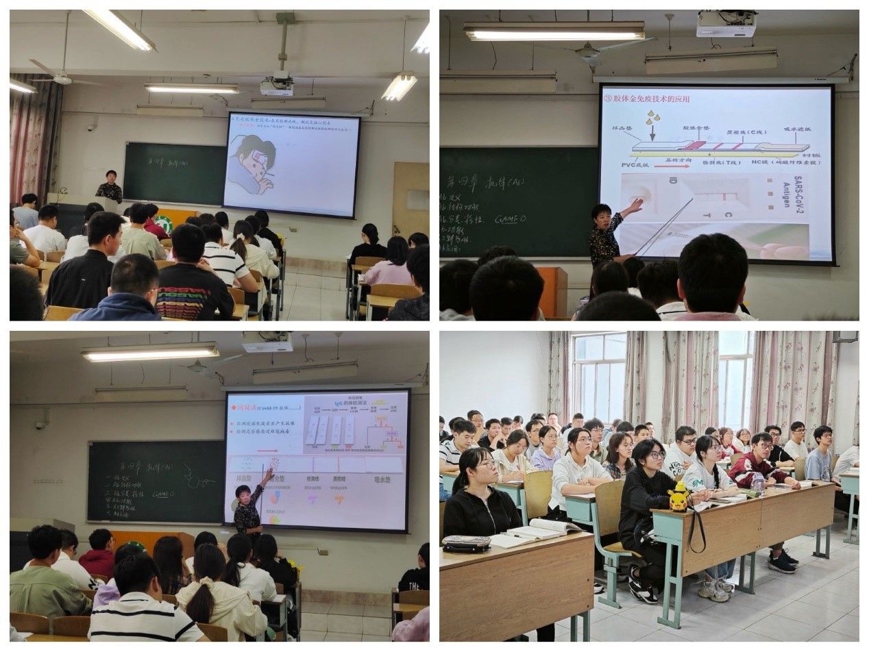 课上,蔡梅红老师在简单回顾上节课堂讲授的抗体的免疫学应用(免疫荧光技术、酶联免疫吸附技术、免疫放射技术)内容基础上,引出本节公开课的新内容—免疫胶体金技术。蔡老师结合我们刚刚经历过的新冠病毒疫情,运用了2022年江苏大学优秀教学案例《居家也知“阳没阳”新冠病毒抗原测试纸的原理及应用》,生动并深刻地讲解了胶体金的定义、免疫胶体金技术的应用特点及应用三部分内容。在深入浅出讲解专业知识的同时,生物技术专业广阔前景、勇于专业探索等思政内容设计方面也自然流畅,不刻板生硬,易于接受,在实现有效知识传授的同时,也促进了专业素养的培养。本次课堂设计、课堂互动、教学效果均得到了同学们和观摩教师的一致称赞。