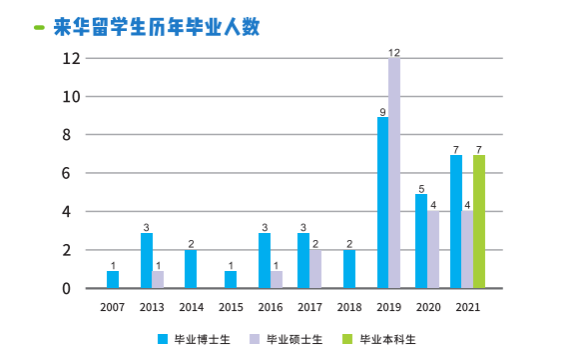 来华留学教育初具规模,培养了来自35个国家和地区的157名留学生,98%以上是学历生。从学历生层次来看,以研究生为主:博士生82人,硕士生55人,本科生17人;从生源国来看,主要来源于加纳、巴基斯坦、尼日利亚、孟加拉等亚非国家。研究生培养方向遍布学院五大研究方向,培养依托项目包括国家重点研发计划项目、国家科技支撑计划项目、国家自然科学基金重点国际合作项目、国家自然科学基金项目等国家重大科技计划,年均科研经费约3000万元。51位教师任研究生导师,占专任教师比例36%,2021年留学研究生授课老师46人,占专任教师比例32%。本科生培养依托食品科学与工程本科专业(该专业两次通过国家工程教育认证评估,入选国家级首批一流本科专业建设点),采取大类培养模式,配置学业导师,实施线上线下混合教学方案和中外融合实习体系,实现培养全方位。2021年留学本科生授课老师55人,占专任教师比例39%。