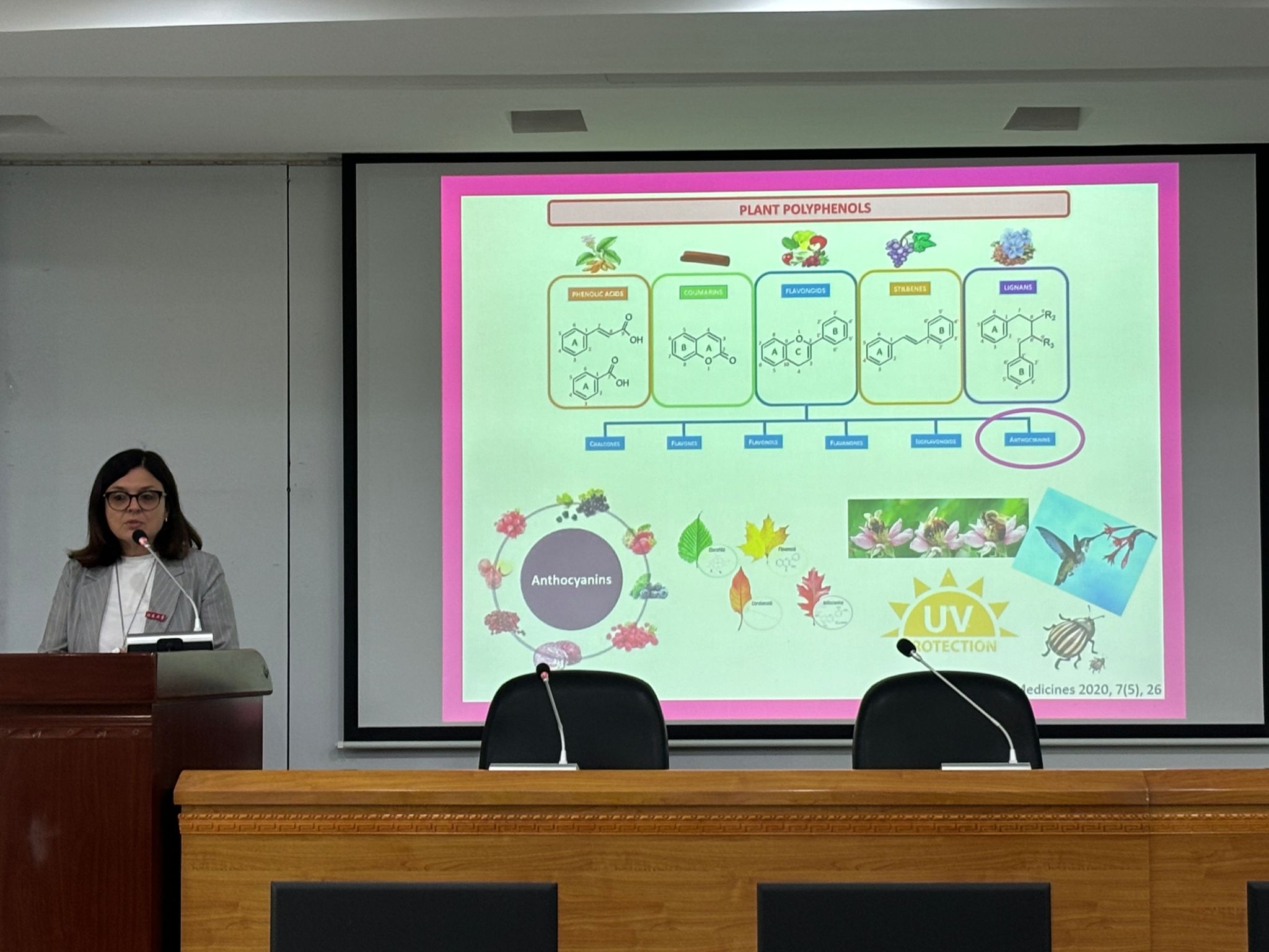 Maurizio Battino 教授主要探讨了膳食中生物活性化合物对乳腺癌的影响;Maria Daglia 教授分享了美黄芩提取物在治疗失眠上的临床研究;Esra Capanoglu 教授重点阐述了采用新技术提高生物活性化合物的含量和生物利用度方面的进展;Francesca Giampieri 副教授主要针对花青素在治疗慢性疾病中的作用研究进行了探讨。国际专家们的报告内容丰富,深入浅出,热情洋溢,引人入胜。报告结束后,各位教授与参会师生进行了气氛热烈的讨论。
