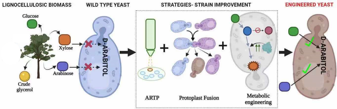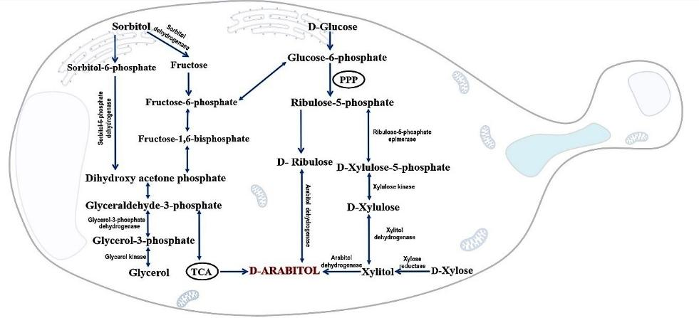 D-阿拉伯糖醇(D-arabitol)是一种木糖醇对映体,其热值(0.2 kcal/g)远低于蔗糖,是一种新型的低热量功能性糖醇,具有改善肠道菌群、抗龋齿、预防肥胖等生理功能,在食品、医药等领域应用潜力巨大。微生物法制备D-阿拉伯糖醇,因环境友好、催化效率高、条件温和等优点备受关注,但微生物法亦因转化效率以及关键酶性质等影响因素,制约着D-阿拉伯糖醇生物合成的工业化进程。齐向辉教授团队以高渗酵母为底盘,围绕关键酶挖掘与改造、代谢工程重塑、酶与细胞固定化、以及生物发酵工艺等方面开展了系列的D-阿拉伯糖醇生物合成的研究工作。该文结合齐向辉教授团队的前期研究成果,对D-阿拉伯糖醇的功能、应用领域、制造工艺、工业化瓶颈与解决策略、商业化前景等进行了综述,重点围绕以可再生资源以及廉价副产品为底物的D-阿拉伯糖醇的生物合成过程、微生物菌株的改良、基因工程方法的高版本底盘细胞构建、生物转化调控条件与机制、下游产物精制以及工业化过程中的问题与对策等方面进行了系统的论述。此外,还概述了D-阿拉伯糖醇生物合成中代谢途径适配的重要性及发酵工艺对D-阿拉伯糖醇生物合成的影响。该文可为D-阿拉伯糖醇的微生物法生产提供有益参考。