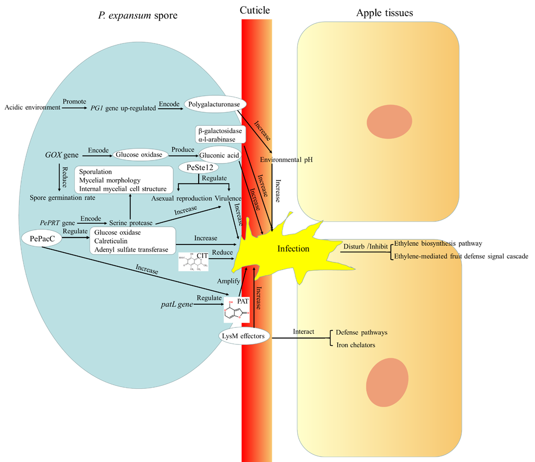 苹果营养丰富、清脆多汁,受到全世界各地消费者的喜爱,是世界主要水果之一。但苹果在采后贮藏期间易受到病害侵染,从而导致腐烂病变,引起巨大的经济损失。其中由扩展青霉(Penicilliumexpansum)引起的青霉病是苹果采后主要病害之一。P. expansum作为一种坏死营养型真菌,它不仅会在苹果采后造成巨大的经济损失,还会产生对人类有害的真菌毒素:棒曲霉素(Patulin, PAT)和桔霉素(Citrinin, CIT),从而导致潜在的食品安全危害。为了更好地控制苹果采后青霉病,需深入认识P. expansum侵染苹果的机制。本文从P. expansum对采后苹果的侵染机制这个角度切入,对P. expansum与苹果之间的研究进展和现状、苹果青霉病的控制方法等进行了系统性的综述。