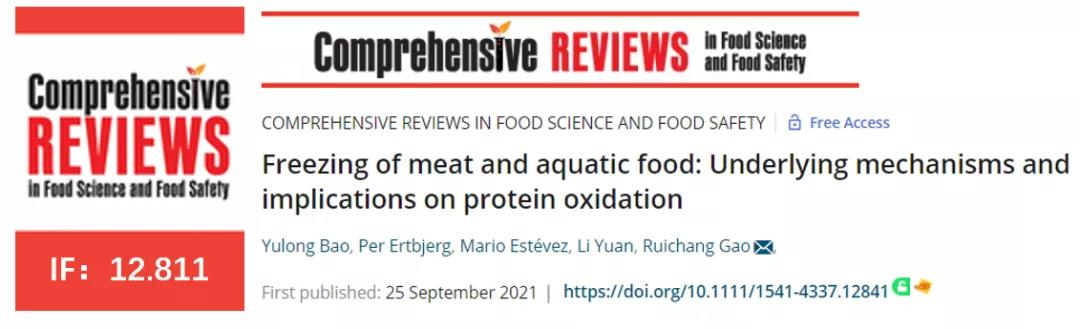 高瑞昌教授水产科学与健康创新课题组标题为“Freezing of meat and aquatic food: Underlying mechanisms and implications on protein oxidation”的综述文章在国际食品领域TOP期刊《Comprehensive Reviews in Food Science and Food Safety》(IF:12.811)在线发表(//doi.org/10.1111/1541-4337.12841)。