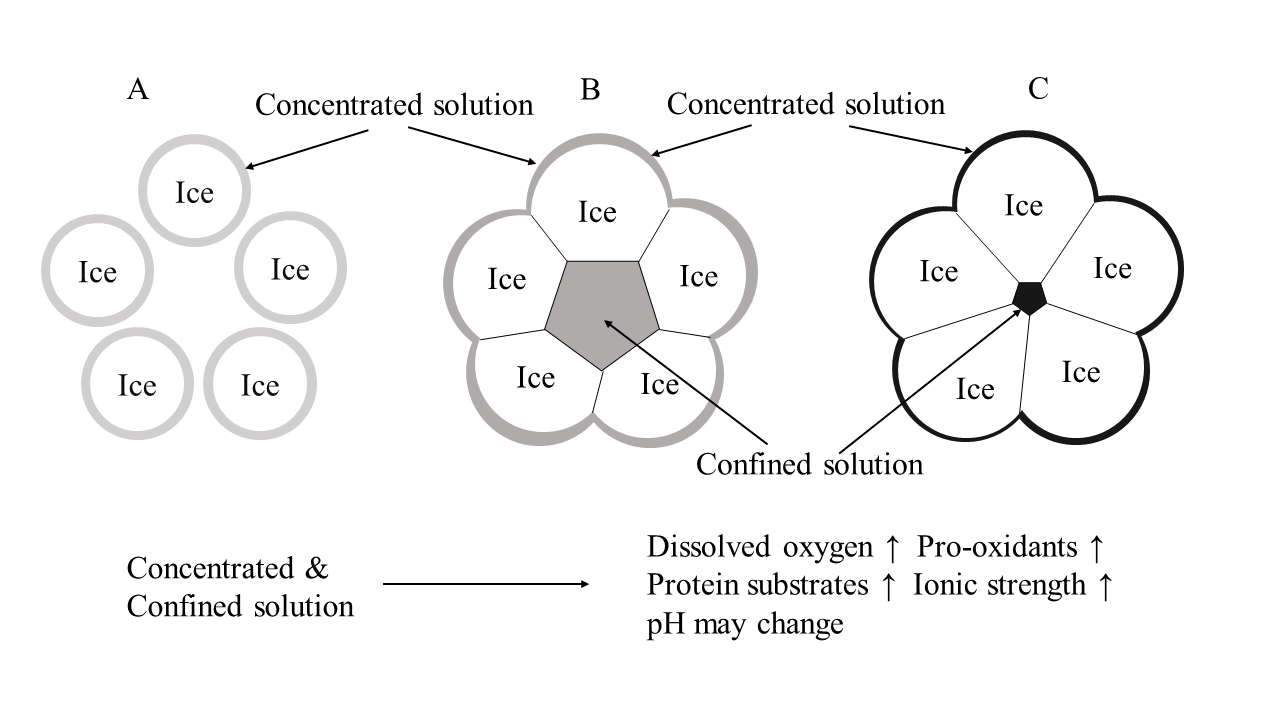 该文章首先简介了冷冻前肌肉源食材基质的特点,主要是肌肉蛋白处于一个大分子密集(macromolecular crowding)的基质中,macromolecular crowding可能会改变氧化反应的动力学性质;随后阐述了冷冻过程中,肌肉体系中的主要变化,包括环境温度的下降、冰晶的形成和变化、冰水界面的形成、溶质的浓缩、pH的变化、脂肪氧化和水解等;接着简要介绍了蛋白氧化的一般性机理及其对肉制品颜色、质地、持水性和营养价值的影响;然后,重点探讨了上述冷冻过程中的理化变化对肌肉蛋白氧化可能的影响机理;最后,阐述了影响肉制品及水产品中蛋白氧化的因素及调控措施。