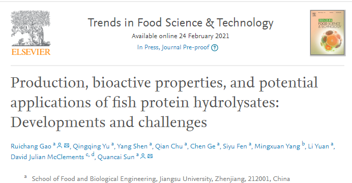 高瑞昌教授团队标题为“Production, bioactive properties, and potential applications of fish protein hydrolysates: Developments and challenges”(鱼蛋白水解物的生产、生物活性和潜在应用:发展与挑战)的综述文章在国际食品领域TOP期刊(No.1)《Trends in Food Science & Technology》在线发表(//doi.org/10.1016/j.tifs.2021.02.031)。澳门新葡京官网 | 2025线上开户直达、真钱百家乐、捕鱼游戏、官方授权