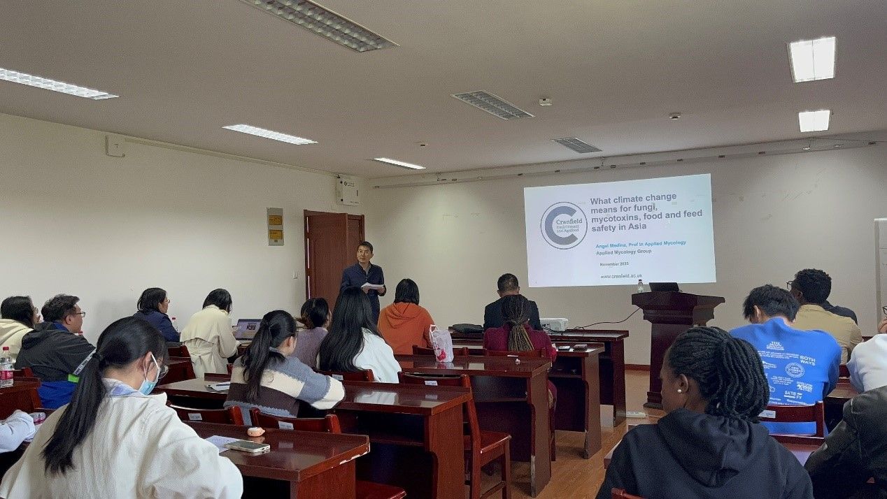 Angel Medina Vaya教授针对气候变化对亚洲范围内真菌、真菌毒素、食品和饲料安全的影响进行了报告。首先介绍了近些年全球气候变化对环境的影响,尤其是温室气体和温度的变化对环境的影响;着重介绍了气候变化对主要粮食(水稻、玉米和小麦)产量和粮食真菌污染的影响,从而以玉米主要真菌黄曲霉产的黄曲霉毒素为主要研究对象,在实验室条件下,研究了水分活度、温度和CO2对黄曲霉产黄曲霉毒素的含量的影响,从而寻找相应的生物控制方法的研究成果。Angel Medina Vaya教授的报告内容丰富,深入浅出,热情洋溢,引人入胜。报告结束后,Angel Medina Vaya教授与参会师生进行了热烈的讨论。